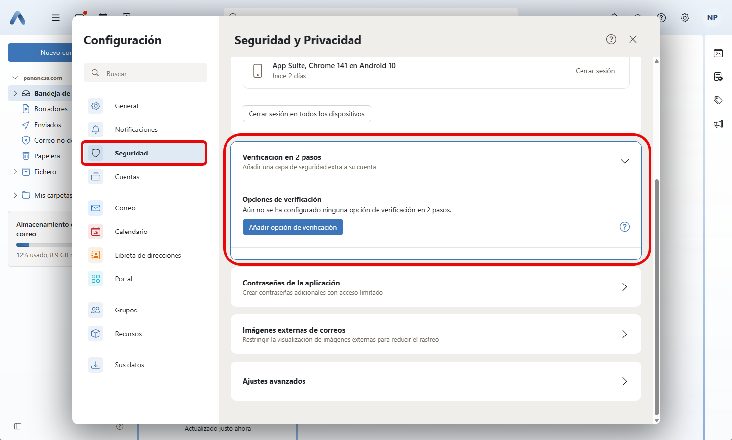 - Dentro de la sección de Seguridad, localiza la opción "Autenticación en 2 pasos" (Two-Factor Authentication) o "MFA".