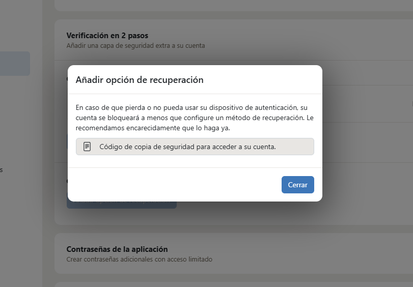 Después de verificar el código de la aplicación de autenticación, aparecerá una ventana crucial que te mostrará tu código de respaldo.