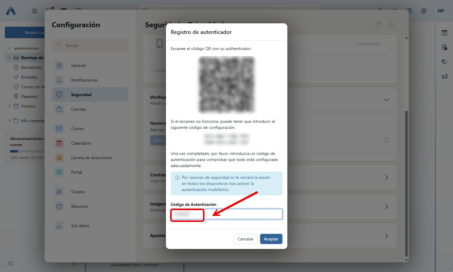 - Ingresa este código temporal en el campo que aparece en la pantalla de OX App Suite.